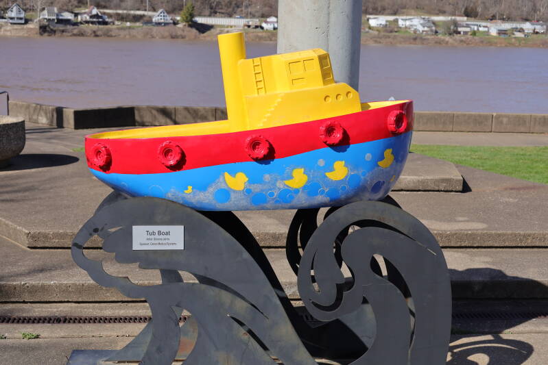 A statue named Tub Boat, part of many tug boat statues on the sidewalks of downtown. This one has rubber ducks painted on the bottom.